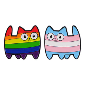 The "Rainbow Kitty Duo Pins" feature two adorable cats, one showcasing the vibrant rainbow flag and the other the trans flag, perfect for celebrating diversity with a touch of feline charm. These durable pins add a playful yet meaningful accent to jackets, bags, or hats, making them a great gift for cat lovers and pride supporters alike. Their compact, eye-catching design ensures they stand out while offering a subtle way to express inclusivity.
